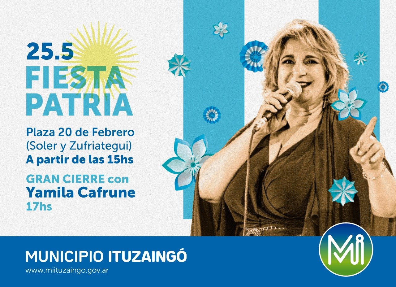 A 212 años de la gesta histórica de 1810, te invitamos a celebrar un nuevo aniversario del 25 de mayo, jornada patria en la que disfrutaremos una Fiesta Popular en la Plaza 20 de Febrero (Soler y Zufriategui), con el gran cierre de Yamila Cafrune, figura del Folklore nacional.